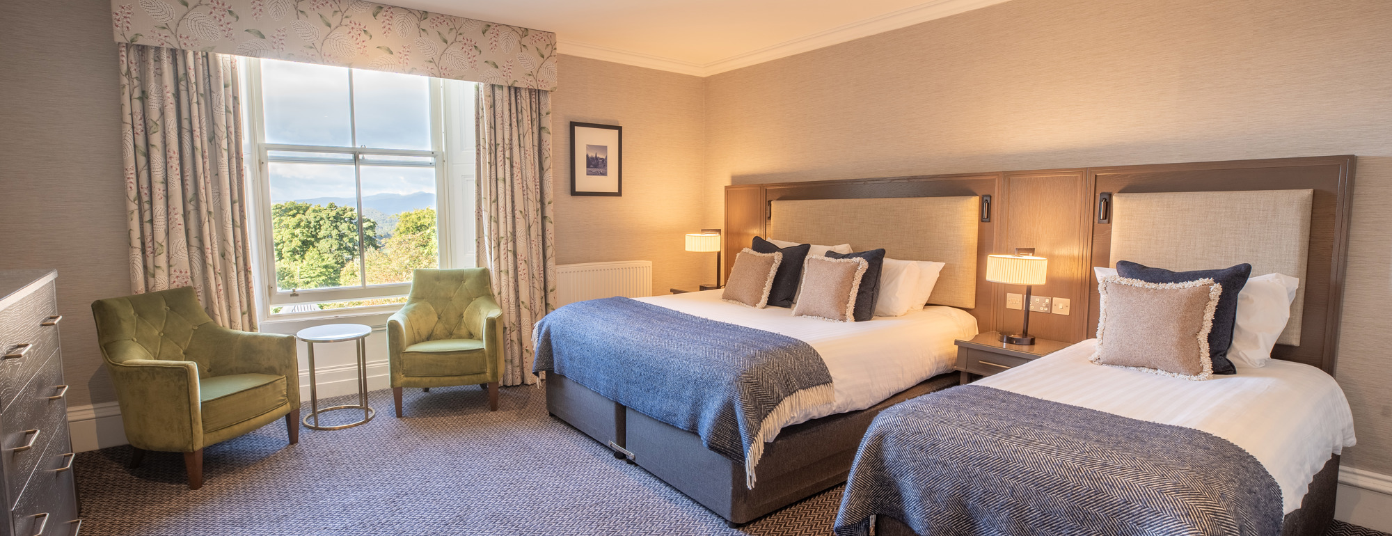 Our Feature Family Rooms offer a spacious and beautifully crafted retreat, thoughtfully designed to welcome families in comfort. Each room has its own layout, character, and contemporary décor, creating a peaceful space to relax together. With upgraded bedding and a bathroom featuring a shower over the bath, these rooms give more space for the whole family to have an unforgettable break.
